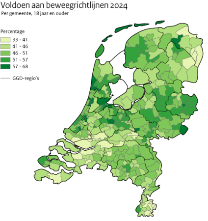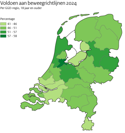 Volgens de Gezondheidsmonitor Volwassenen en Ouderen 2024 voldoet gemiddeld 48,9% van de volwassenen van 18 jaar en ouder aan de beweegrichtlijnen. Per GGD-regio varieert het percentage van 41,5 tot 57,1%. Meer gegevens over dit onderwerp zijn te vinden door op de kaart te klikken.